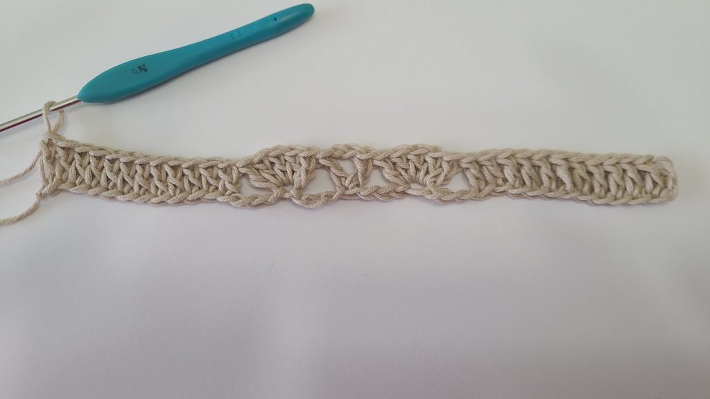 Row 4: ch 3, turn, dc into the next 2 sts, * sk1, [dc, ch 2, dc], into the ch2 sp from previous row, sk 1, dc into the next 5 sts, rep from * to eor, dc into the last 3 sts.