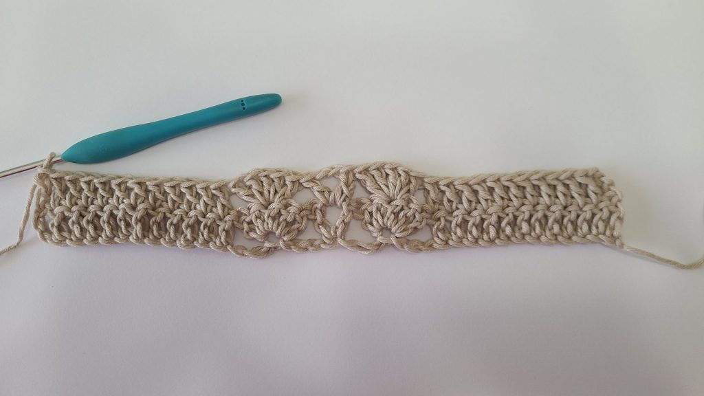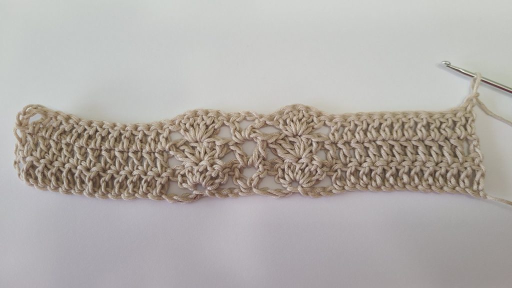 - At the beginning of Row 2, you have to skip 2 stitches before the 5dc and after the second 5dc on the other side of the row.
