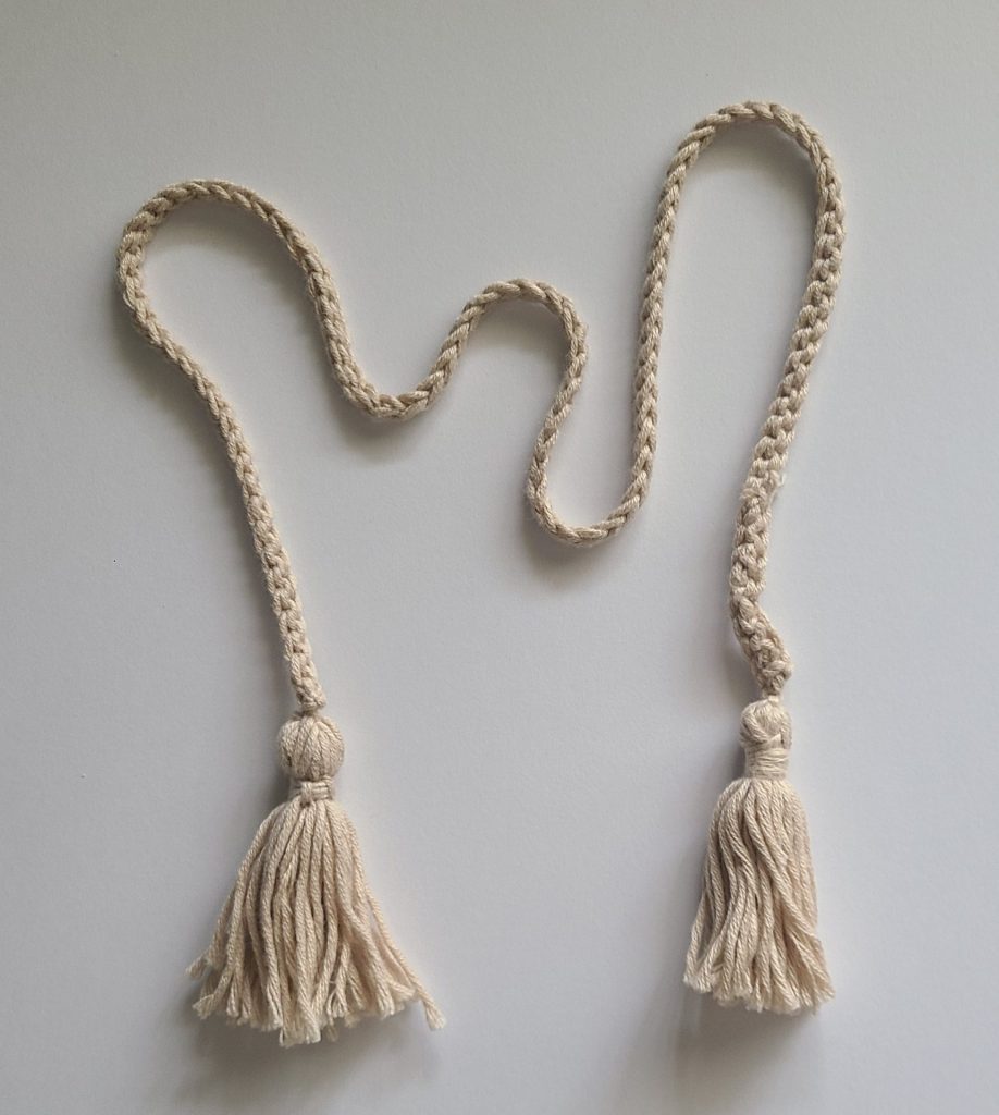 Using the same yarn, wrap the yarn around a 4” book 40 times. Tie a piece of yarn around the top of the bundle and cut the other end. Tie a second piece of yarn an inch from the top of the bundle and trim the bottom strands. Add a bead to the top piece of yarn and tie securely Make two tassels for both sides of the cord.